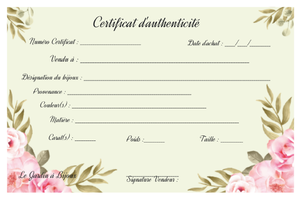 A partir du 20 Mars 2026 un Certificat d'authenticité sera disponible pour chaque articles. Veuillez donc bien vérifier l'orthographe de vos Noms et Prénoms lors de votre inscription et commande. La facture d'achat vous est envoyé lorsque vous finalisée la commande. Vous recevrez les étapes de votre commande. Pour toutes réclamations ou questions veuillez envoyer un email à lejardinabijoux18@gmail.com ou bien par téléphone au (+33) 07 59 04 90 29 pour les personnes résident hors de France WhatsApp est disponible.