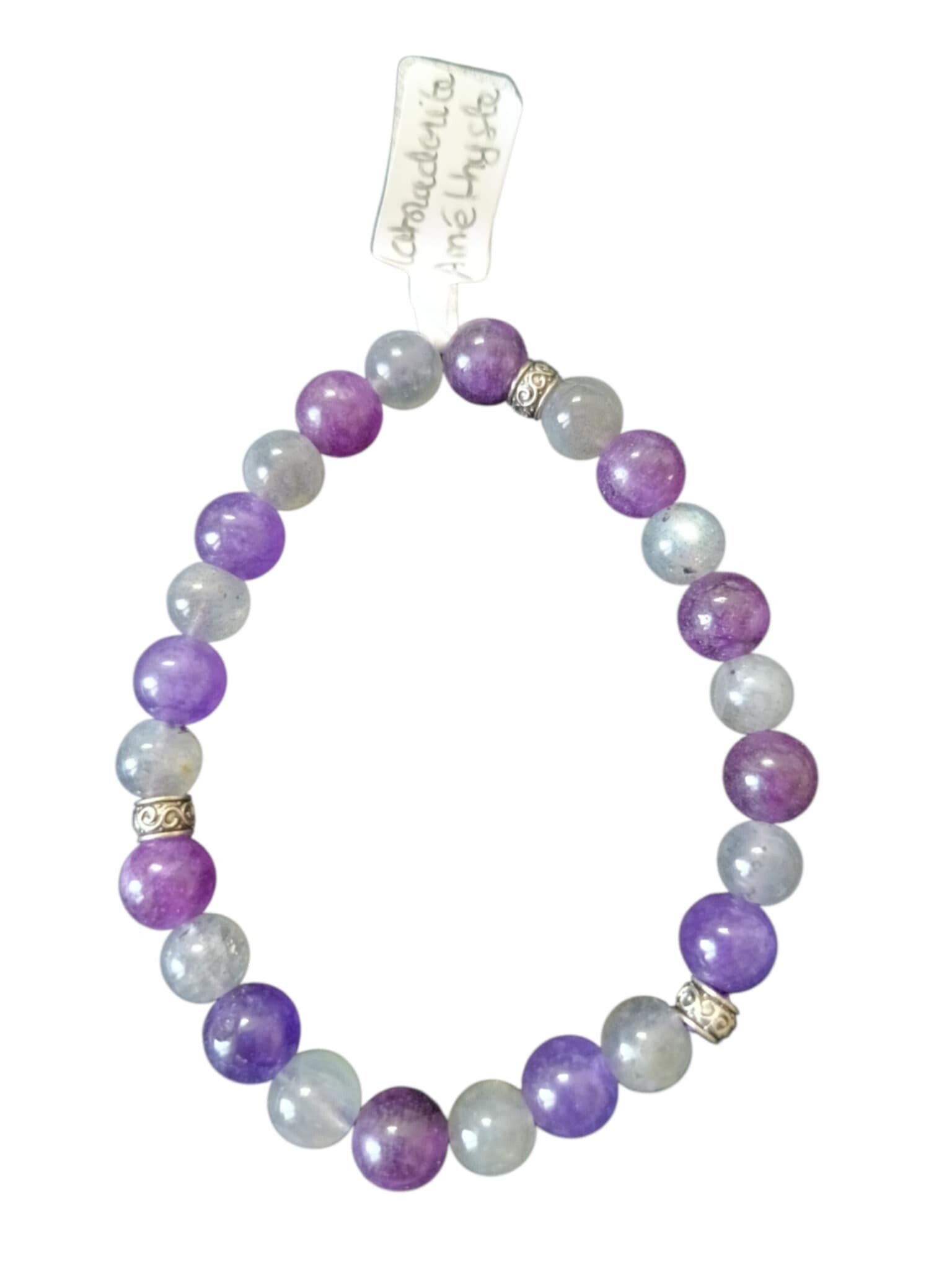 Elle symbolise la sagesse, la sérénité, la spiritualité. Elle favorise les prises de conscience, l'élévation spirituelle, la clarté de l'esprit. L'Améthyste agit contre le stress, calme les angoisses et est efficace contre les troubles du sommeil. Liée au chakra Couronne.